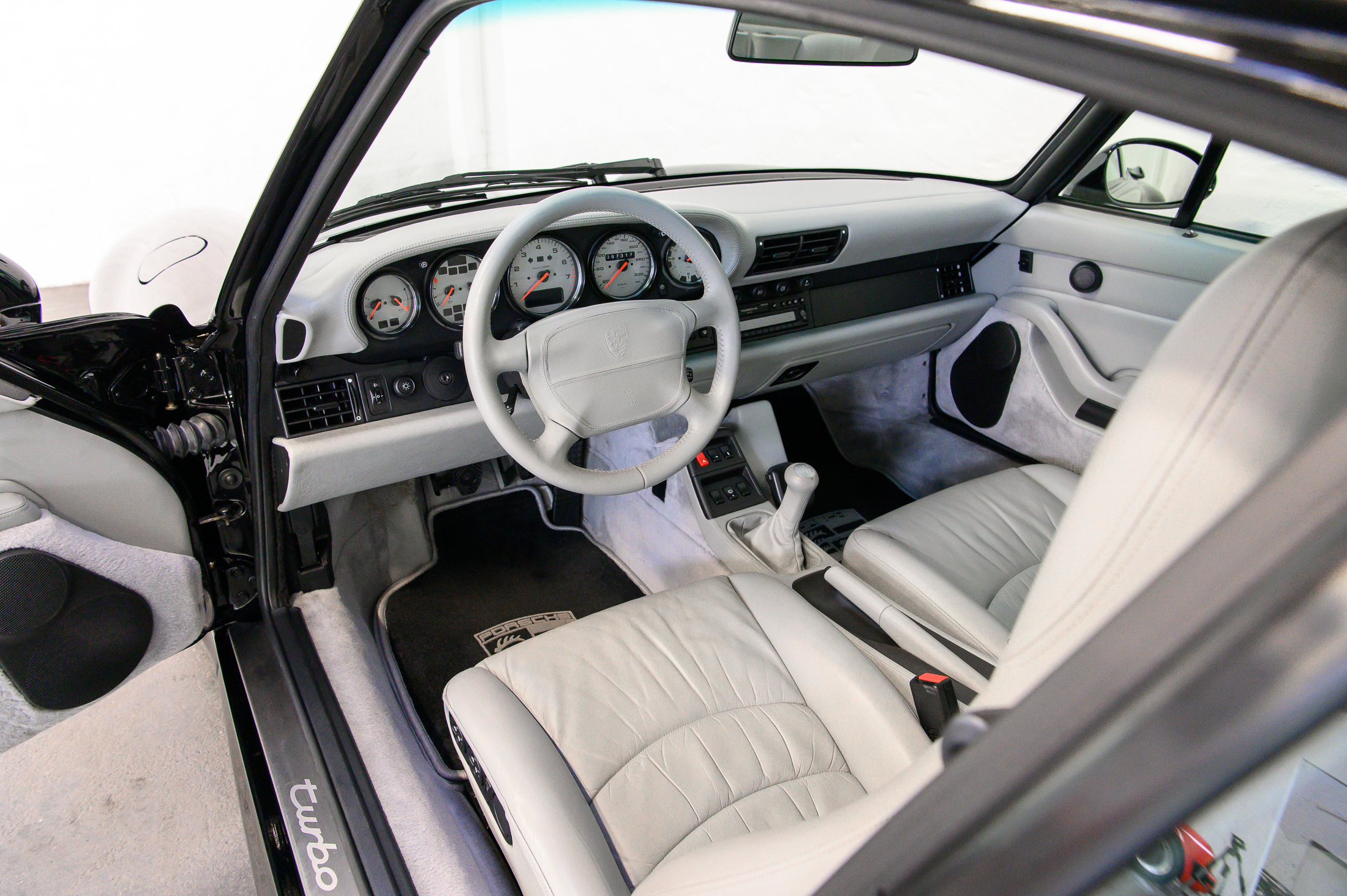 Neben der niedrigen Laufleistung und der exklusiven Volllederausstattung in der Farbe „Marmorgrau“ begeistert dieser 993 Turbo insbesondere durch seinen bis ins Detail originalen Zustand. Das Interieur präsentiert sich äußerst gepflegt und frei von Patina. Das Fahrzeug ist unfallfrei; sämtliche Karosserieverbindungen sind unberührt und original. Bis auf Fronthaube sowie Teile der vorderen Kotflügel befinden sich die Lackstärken auf Erstlackniveau. Keinerlei Tuning oder sonstige Veränderungen stören den ausgezeichneten Fahreindruck oder das Erscheinungsbild. Lediglich die originalen Doppelendrohre des Turbo S wurden nachgerüstet.